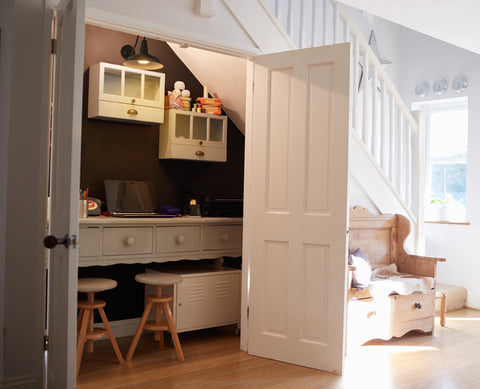Speaking to wall sconce,i want to digress here. This is a modification I love.This is a learning field transformed from a under stairs.Place a desk, a chair, a light, and a door, and it becomes a super private area.