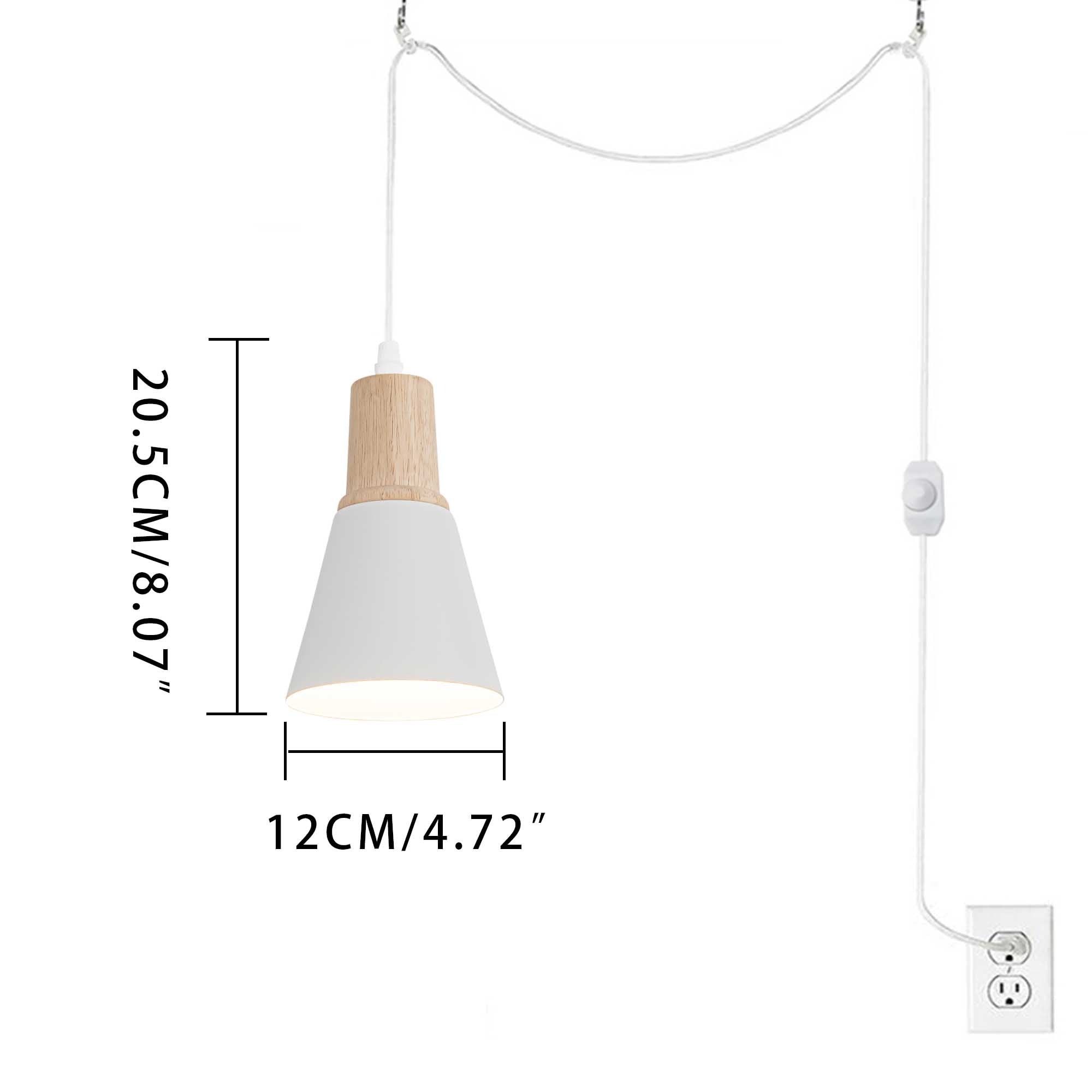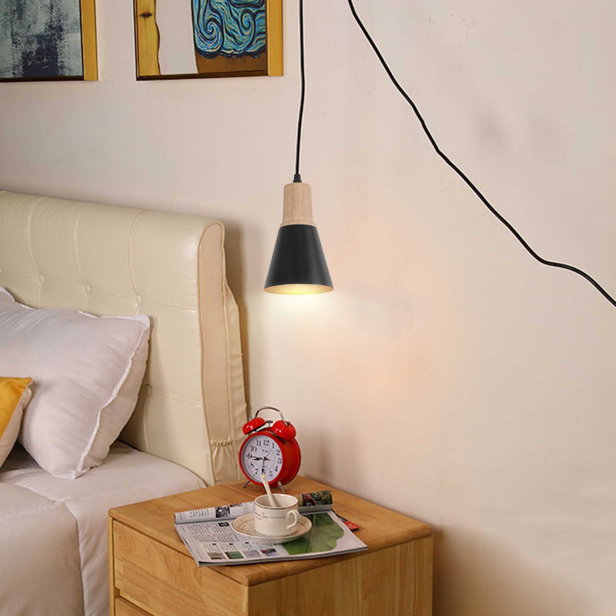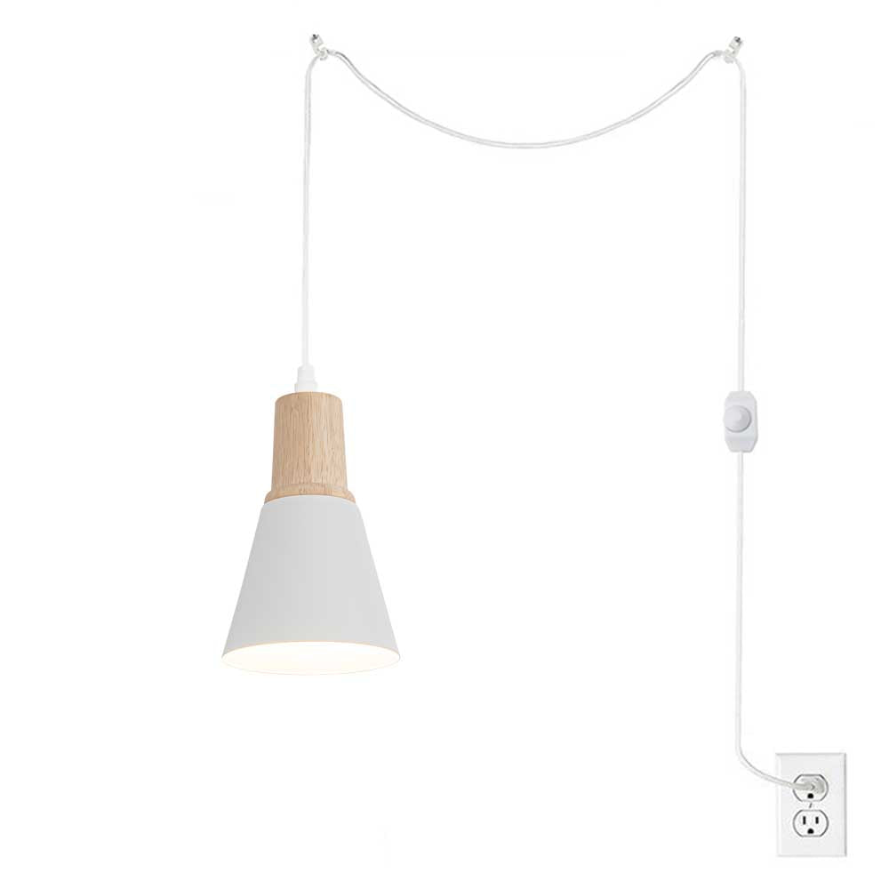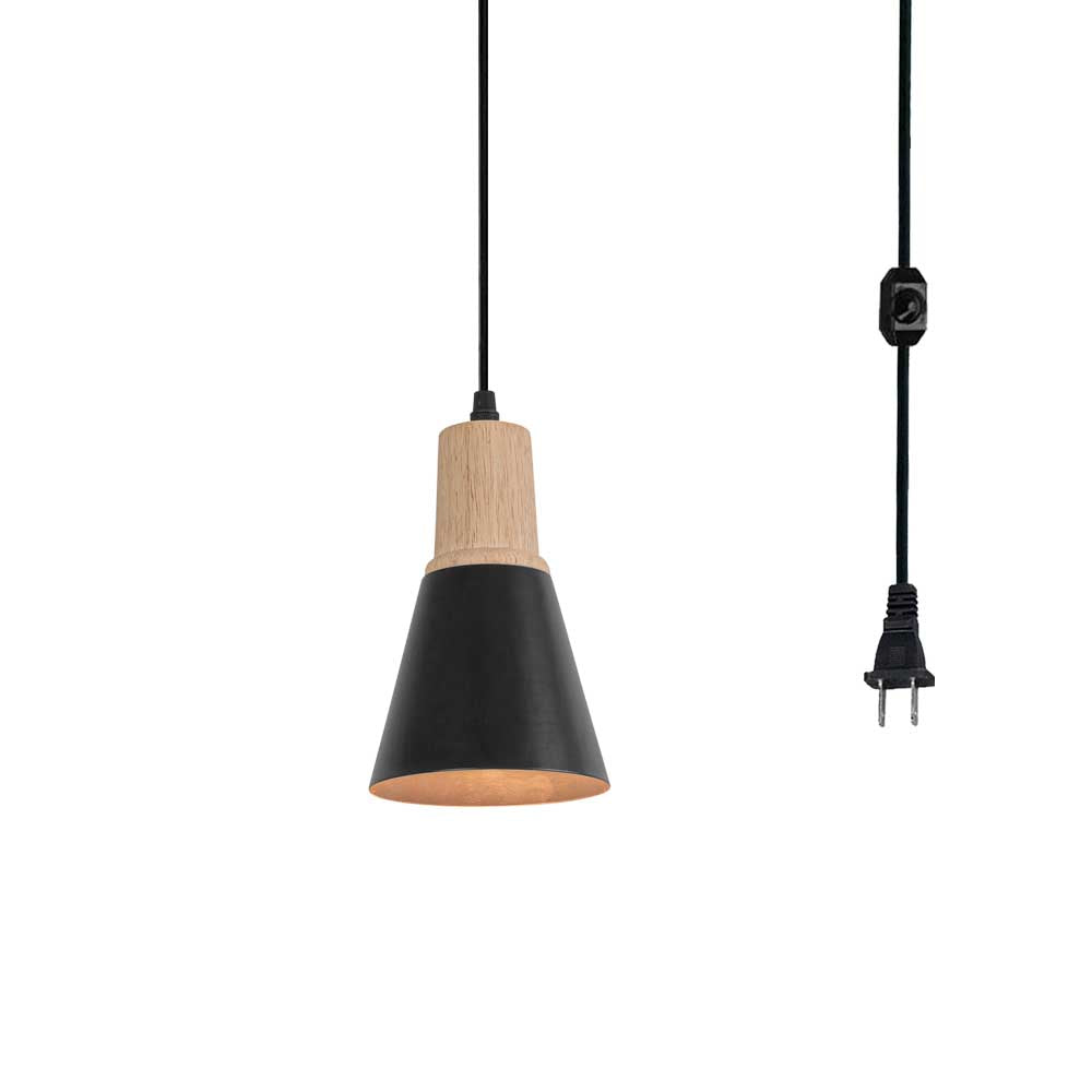 Plug In Outlet Corded Hanging Light Wooden Base Metal Black/White Shade Retro Living Lamp